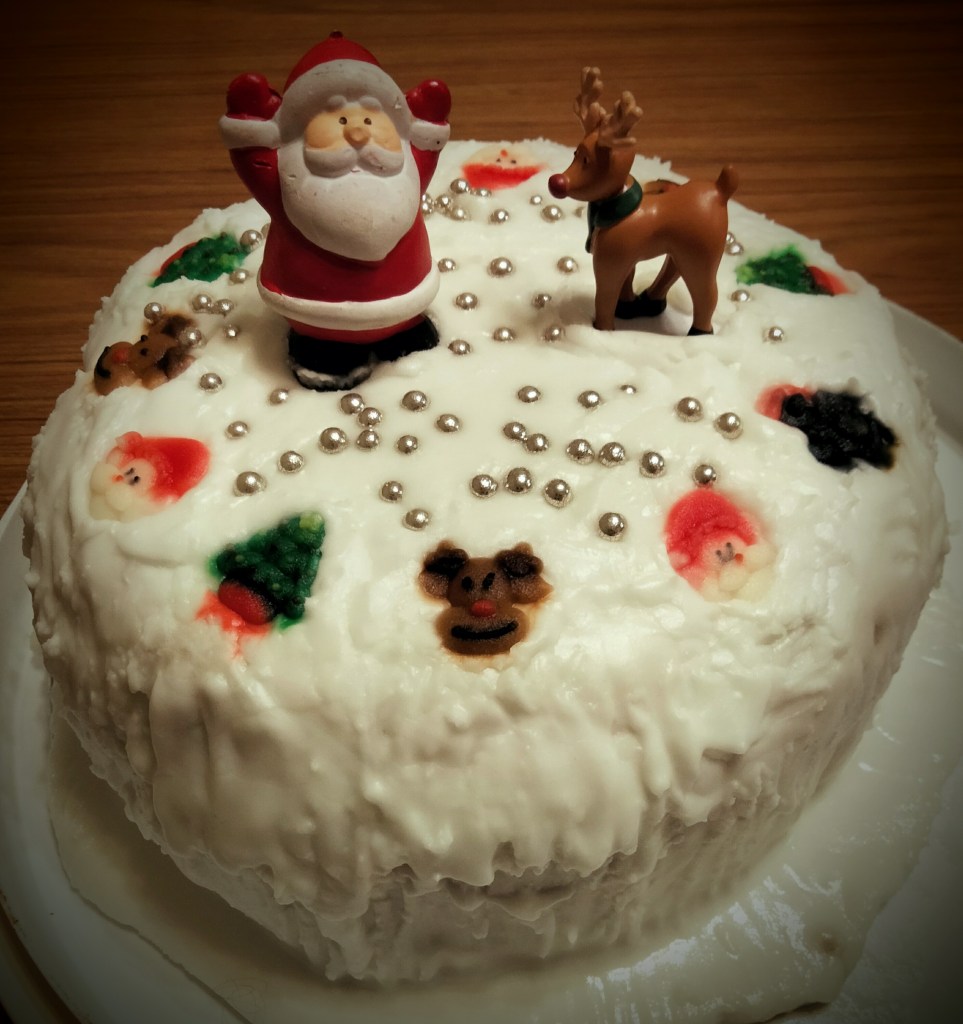 On that note I shall bid you goodnight and leave you with a pic of my cake now covered with the almond paste. The darker blob is where I spilt some apricot jam – it’s what I use to stick the paste to the cake. I’lll leave it a day for the almond paste to dry before putting the icing on. Just as well I made it, huh?!