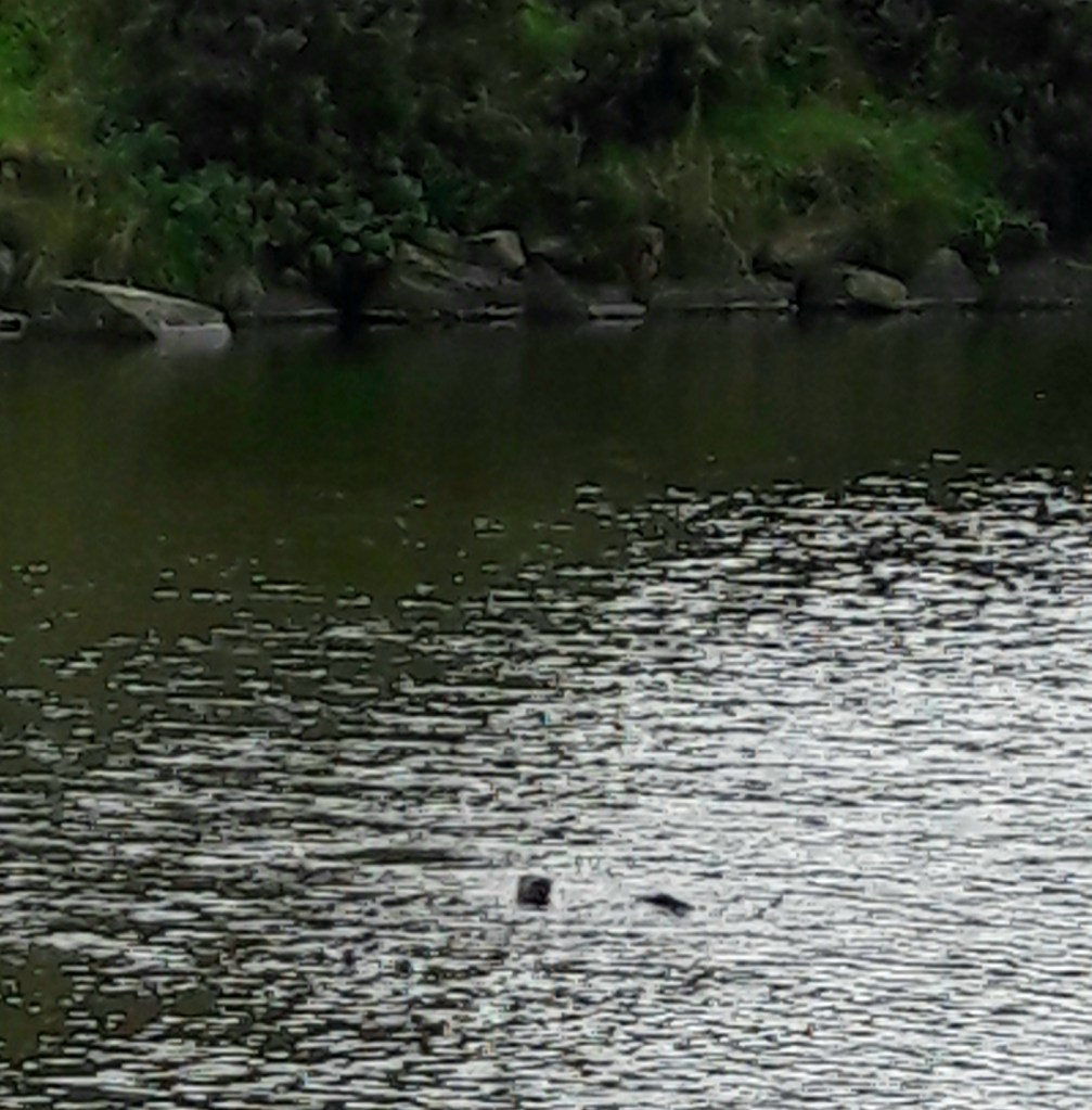 Ah, hang on, no, everyone’s attention was on something else, something to the left of the swan. A ripple, did a fish just jump? And another one. And I saw it – an otter! Holy mackerel, Batman! That’s a first, an otter in the top pond, and it was having a fine time frolicking! Oh, she knew how to work the crowd, a little peekaboo here, a frisky leap there, disappear a while to keep us in suspense, only to reappear a short distance away for a brief flirtation before diving down again with a flick of her tail.