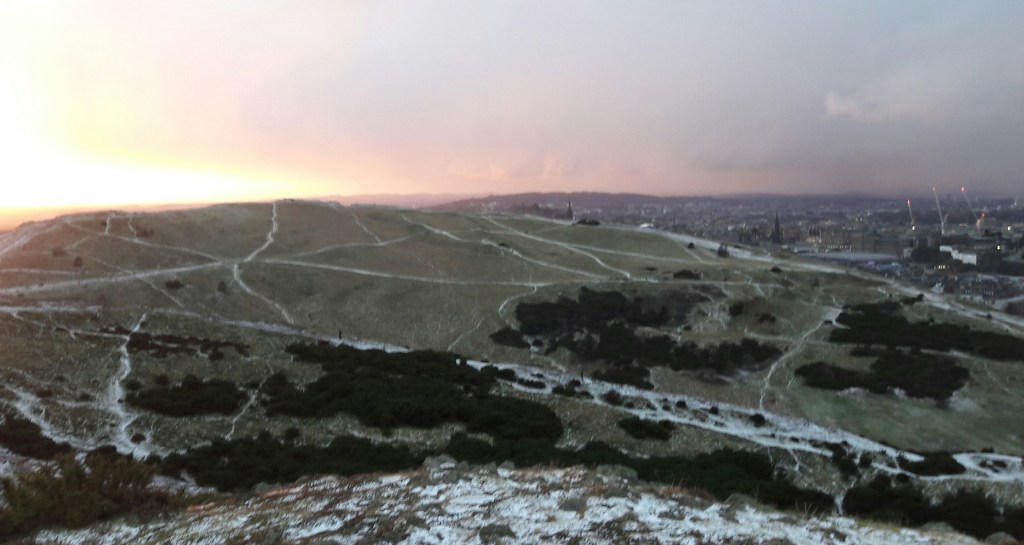 By Sunday afternoon the temperature was up above freezing and the snow starting to vanish away. Now that was a very clear evening, I was delighted to have Orion and his belt before me in the sky as I wound my way up round the Park on the Queen’s Drive. Can’t remember the last time I saw him, and I spotted the Big Dipper – they’re the only two constellations I know (oh, and the Southern Cross when I was down under). Dunsapie Loch was two thirds clear with the wind really choppying it up, the more sheltered end nearest the carpark was still very iced over. It was a beautiful evening walk, plenty of other folk had the same idea, and a few twinkling lights way up towards Arthur’s Seat denoted the hardiest of night strollers (one time it would be great to do).