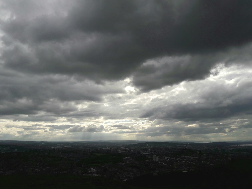 As I lay there it occurred to me to share with you just what I could see at that moment, so, a head turn to the right and it’s Arthur’s Seat, and above me some rather worrying clouds (glad to say they all just moved along without shedding their loads).