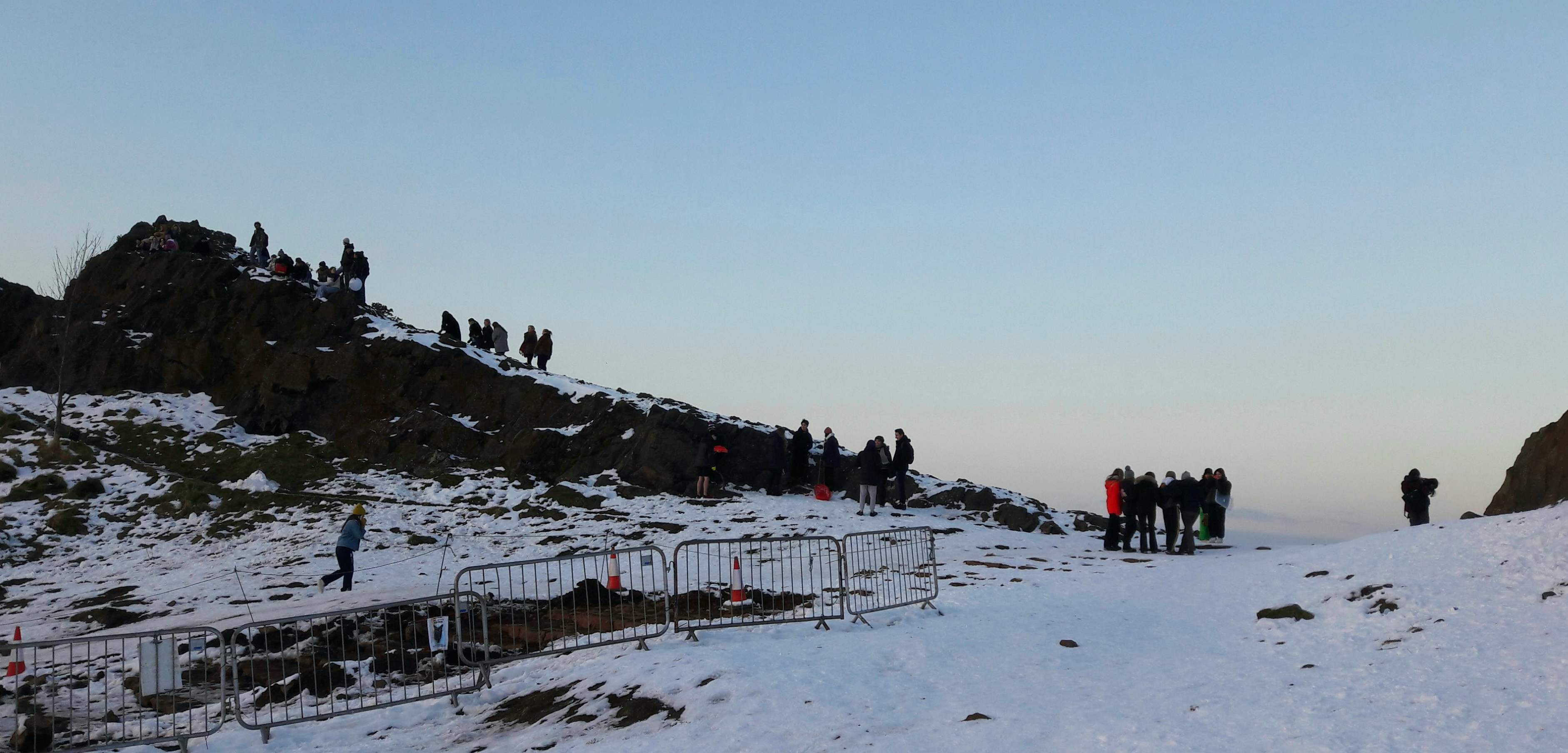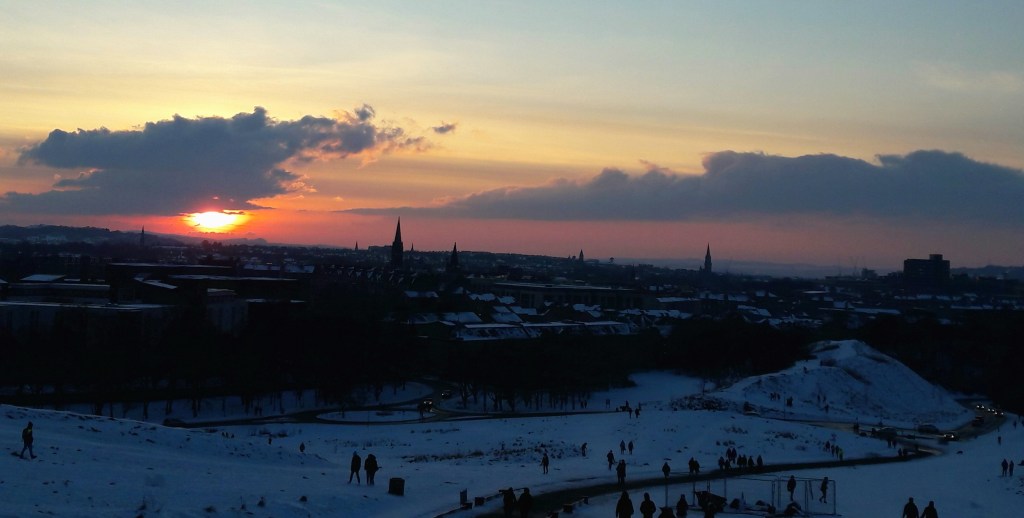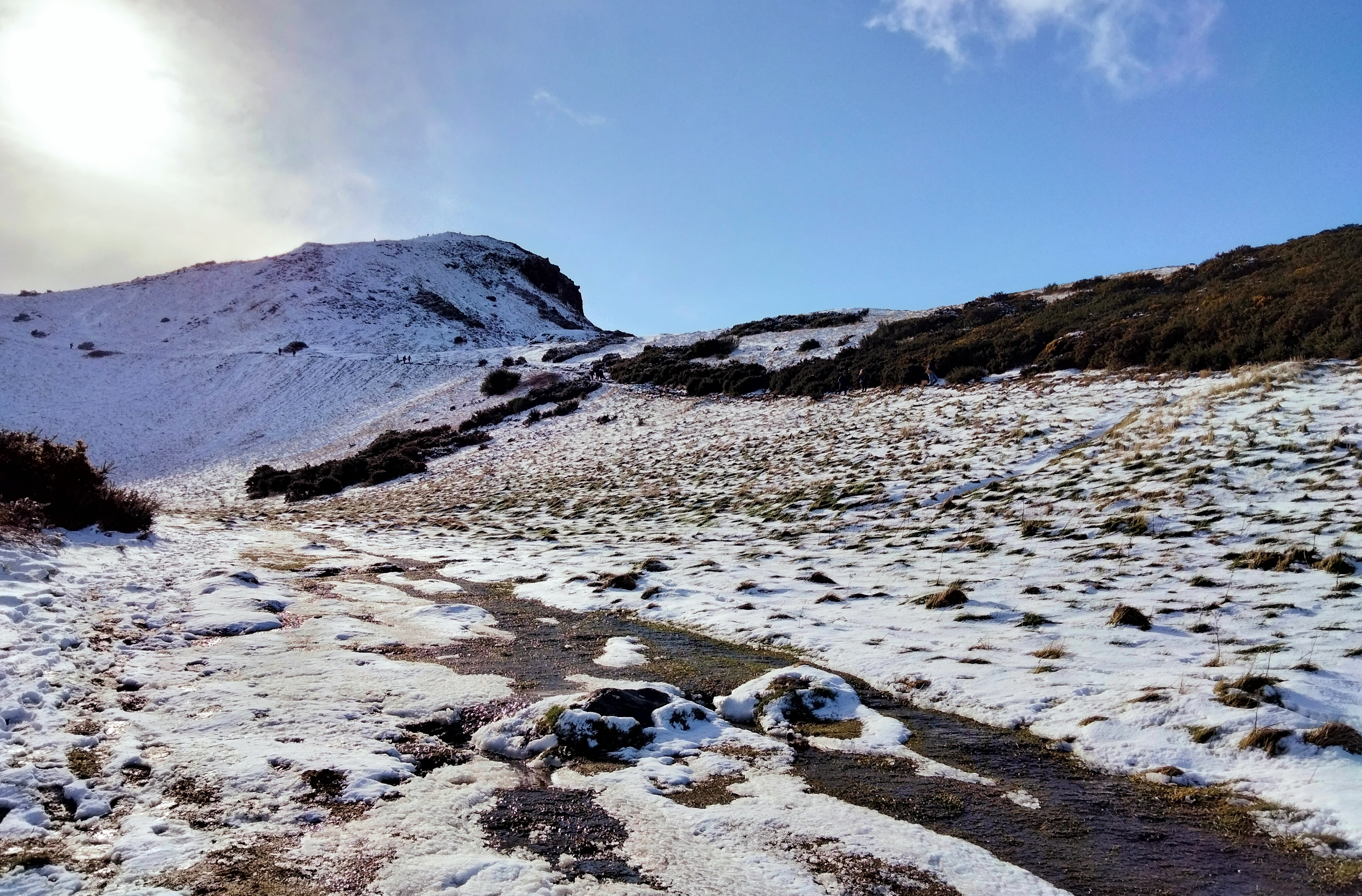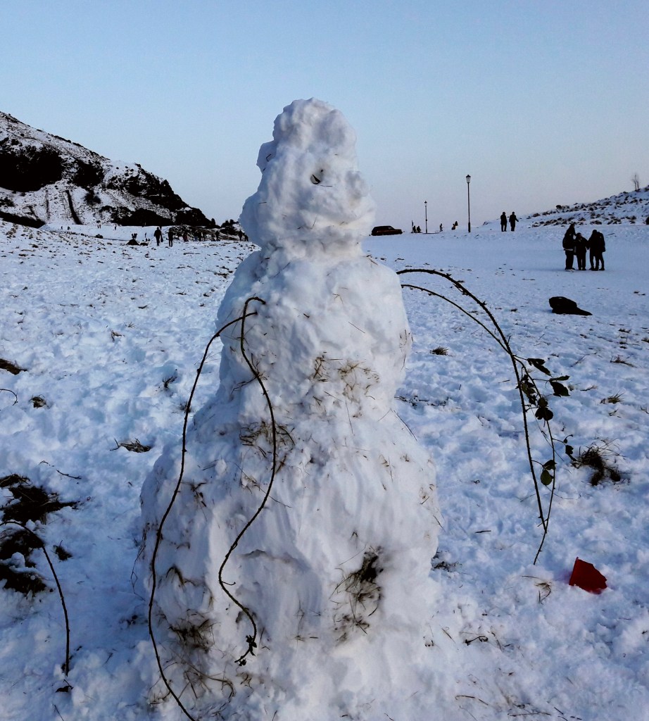 We had snow, yay. Not much but enough for more snowmen sentinels to rise up again and a few snowboarders headed up into Holyrood Park for a bit of fun. Of course, I had to head out too, I mean, look at it …..